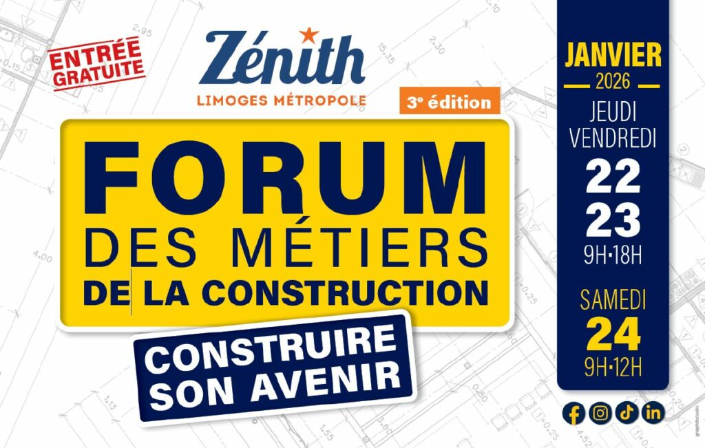 Venez découvrir les multiples possibilités qu’offre le secteur de la construction, au Zenith de Limoges du 22 au 24 janvier 2026.
